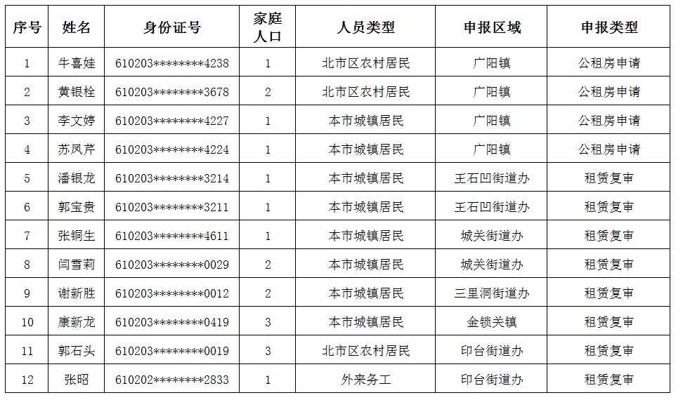 铜川市印台区2025年11月12日申报保障房家庭公示