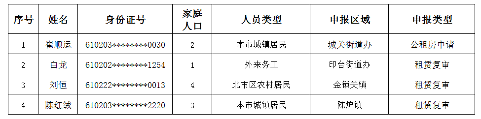 为了确保我区保障性住房分配的公平、公正、公开,根据市、区保障房申请、审核相关规定,经区房屋管理中心资料审核,现将符合条件的拟分配保障房家庭进行公示。公示五个工作日:2025年12月4日至2025年12月10日。如有异议,请于2025年12月11日前向铜川市印台区房屋管理中心举报,联系电话0919-4563830